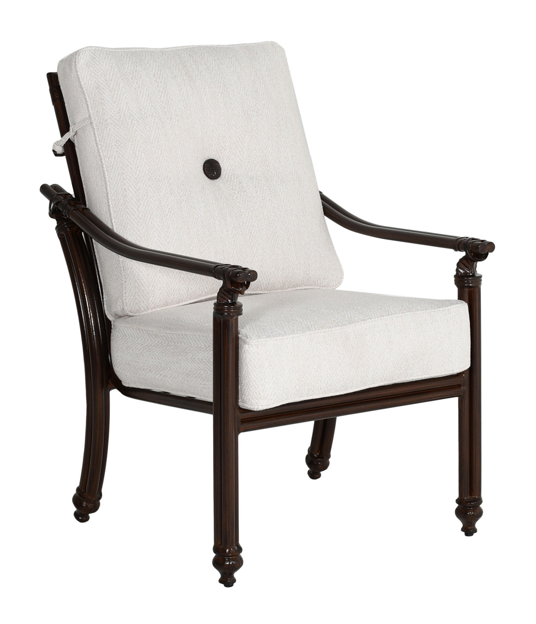 The Coco Cushioned Dining Chair brings relaxed sophistication to outdoor dining spaces. Designed with soft curves and a hand-finished aluminum frame, it captures the look of woven textures while offering the strength of cast and extruded construction. A supportive seat cushion adds comfort for lingering meals, while the sculptural backrest elevates its presence at the table. Whether placed on a patio, terrace, or veranda, this chair blends seamlessly into settings that call for both durability and charm. Made to order in your choice of Castelle fabric and finish, it can be styled to suit your complete dining vision.