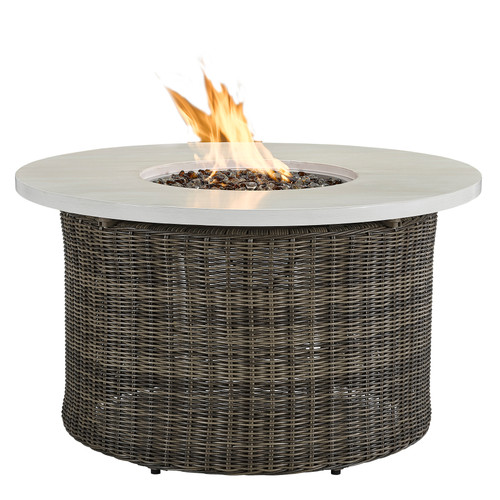 - FEATURES: Hand-woven classic basketweave contrasted by the decorative plaited chevron design. Aluminum top in a powder-coated faux travertine finish. Includes burner cover. Slide out drawer for propane gas storage. Propane gas fueled. Will produce 60,000 BTU.